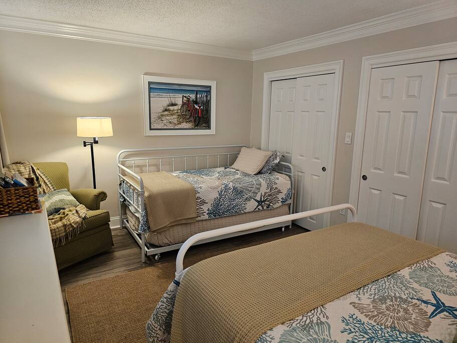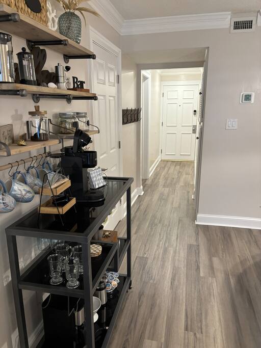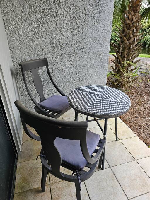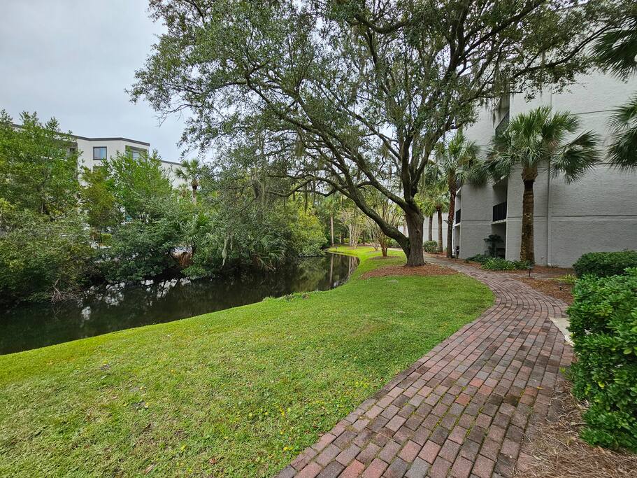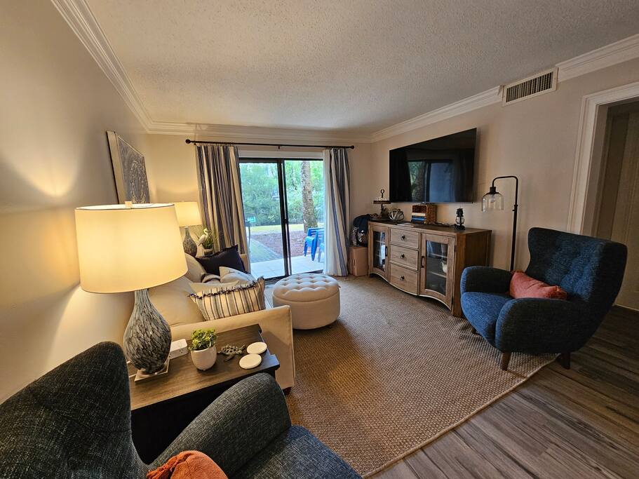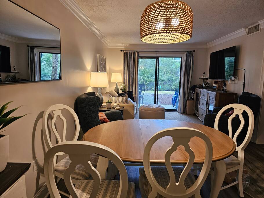 Isla Bella is a large (1050 sq ft) ground floor, no step, turtle lagoon Villa - 1 block from the beach. 5 min walk. Experience coastal living at its finest in this beautifully 2025 renovated 2-bedroom, 2-full bathroom ground-floor villa at South Forest Beach. Enjoy your favorite drink while watching turtles sunning and swimming from your private covered patio – a magical feature unique to this property that delights guests of all ages. Located just a 5-minute walk to Forest Beach and a few blocks to Coligny Plaza's 60+ shops and restaurants, this accessible villa offers the perfect "park once, bike and walk everywhere" vacation. Island Life bike rentals available next door at the DoubleTree. Enjoy the 60 miles of bike trails all over the Island. Enjoy Sea Pines Resort about a mile away. This resort has shops, restaurants including the Salty Dog Cafe, a large terrific Oak Tree playground, South Beach Marina, and the world famous Harbour Town golf course and iconic lighthouse. Harbour Town has many family activities. Kids love a cruise on a Pirate ship. Families enjoy a dolphin site seeing cruise or fishing trip. Couples can have dinner while sailing the waterways at sunset. The 2025 full renovation features a king primary suite with king bed, queen guest bedroom, all new hotel mattresses, room darkening curtains, and modern amenities including granite countertops, LVP floors, (no carpet),new lighting, new furniture, 1-Gig WiFi, three large Roku Smart TVs, and fully equipped kitchen with all new stainless appliances. Additionally, the HVAC and water heater are brand new. The patio features Edison lights, a Bistro table and plenty of Adirondack chairs for everyone. There is a dedicated Coffee Bar that provides coffee by K-cup or Drip coffee. If you prefer to grind your beans or French press, you can have it all. If you prefer tea or hot chocolate, those are available as well. Enjoy resort perks like a pool, tennis, and pickleball courts. Families love the provided beach gear (wagon, umbrella, chairs, games), high chair, Pack 'n Play, and toys. Best of all, absolutely no stairs. Walk straight in. One floor – perfect for seniors, families with strollers, or anyone seeking easy accessibility. Watch turtles and graceful birds, easily walk to beaches, enjoy mini-golf, shops and restaurants. Bike the beautiful bike trails. Create unforgettable Hilton Head memories at Isla Bella villa!